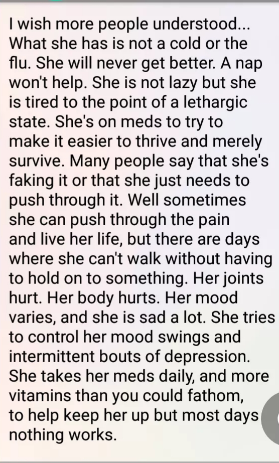 In recent weeks, both of my young adult sons have, separately, encouraged me to begin walking regularly, sure that’s all I need to feel better. I agree with them that walking routinely would be helpful and it is a goal, but it’s not the cure. If I’m having a good day, I can handle stairs occasionally throughout the day, all the way into the evening. A couple of 15-20 minute chore sessions are tolerable. If I’m feeling so-so, two or three trips on stairs is all I’ve got and housework is hit or miss. Unfortunately, I’m frequently unable to ascend or descend even once. On such a day, I look around at all the chores need to be done and hope I can get to them tomorrow.
