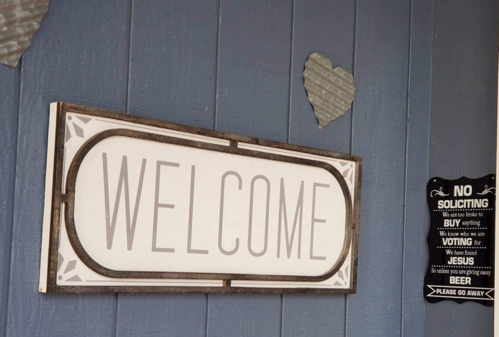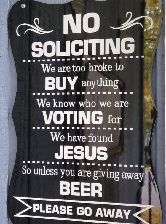 Can you guess which front porch sign I chose and which one my husband installed later? The first time a solicitor presented afterwards, he was surprised and a bit offended. Following a second salesman wanting to give an estimate for some service or other, my husband was really irritated. He’d planned to ask for a beer but hadn’t gone through with it. He would next time, though. For sure. Gonna do it. A couple days later, the opportunity arose. When the door opened, alas, it was a young girl selling cookies. 😆😆😆